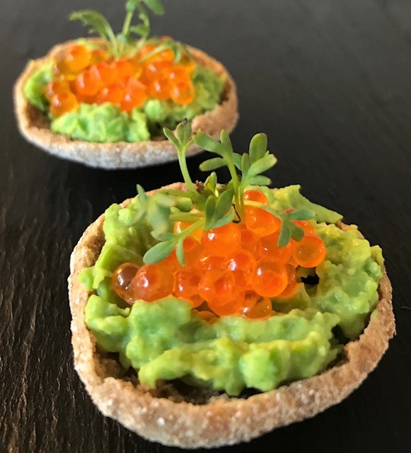 Rågchips fyllda med len ärtkräm som toppas med salta fina korn av laxrom. Vill man kan man även lägga på en klick crème fraiche om man tycker det är gott.