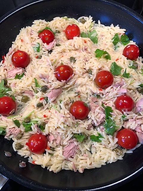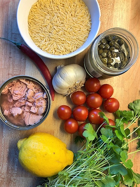 Det är väl inte många som jublar över en burk tonfisk precis..! Men i denna rätt smakar det till och med riktigt gott . Med god sälta från kapris, sötma från tomater och en härlig syra från citron. Tonfisk på burk av bättre kvalitet brukar finnas på saluhallar eller hos välsorterade fiskhandlare.