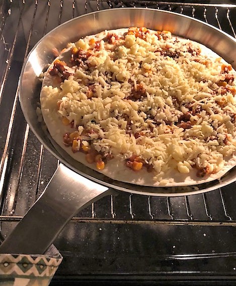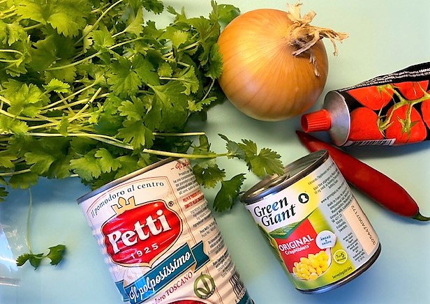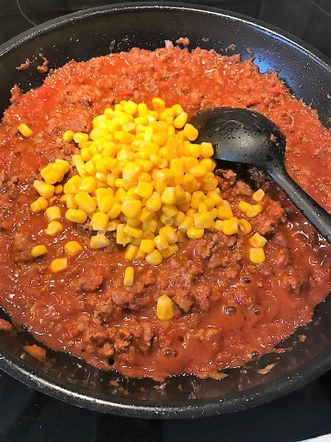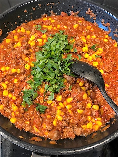 Värm ugnen till 200 grader. Fräs lök mjuk i olivolja. Tillsätt tomatpuré, färs och chili, och stek tills all färs är genomstekt. Krydda med spiskummin, koriander salt och peppar. Häll på krossade tomater och låt puttra tills det mesta av vätskan kokat in. Tillsätt majskornen och den hackade persiljan. Ta av från värmen.