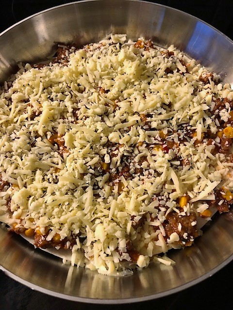 Lägg lite av köttfärsen i botten på en rund form som tål ugnsvärme. Varva sen köttfärs och tortillas och toppa med riven ost. Sätt in i ugnen ca 25 minuter tills osten smält och fått fin färg.