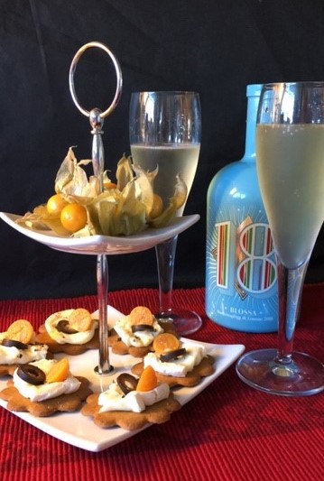 Lägg en skiva ost på varje pepparkaka. Garnera med oliv och halverade physalis. Klart!