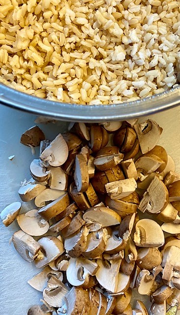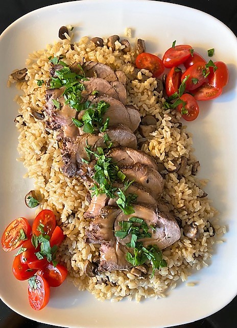 Servera steken med ris och stekta champinjoner som på bilden eller t.ex. krossad ugnspotatis.