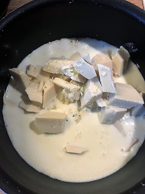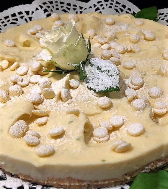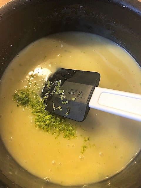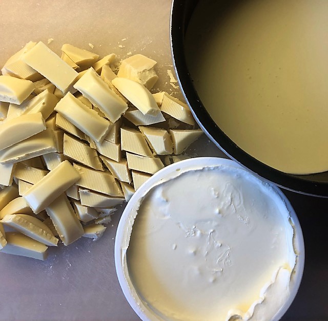 Bryt chokladen i mindre bitar. Koka upp grädden, lägg i chokladen och rör tills den är helt smält. Blanda i rivet limeskal. Tillsätt mascarponeosten och blanda samman med en elvisp till en smidig smet. Bred ut fyllningen i formen, låt stelna ca 6 timmar eller över natten.