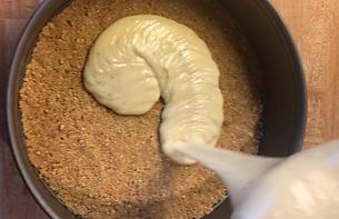 Kör digestivekex och smör i en mixer till en smulig massa. Tryck ut blandningen i en form, ca 20 cm i diameter, med löstagbara kanter. Ställ in i kylskåp.