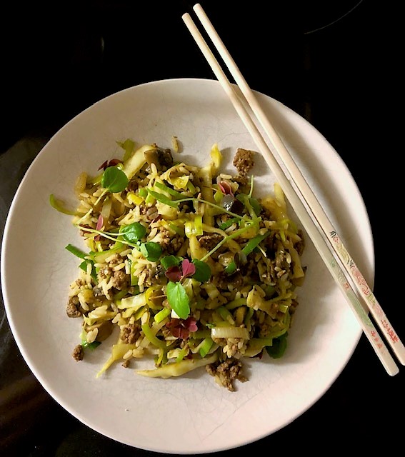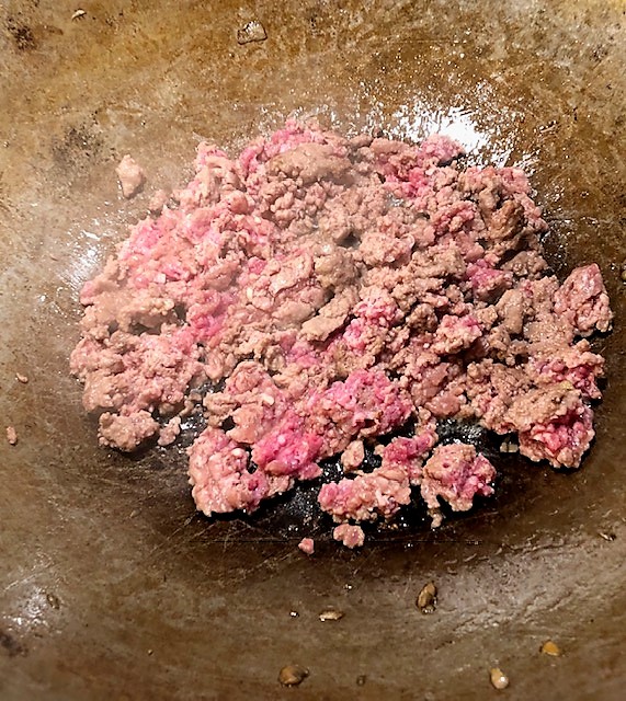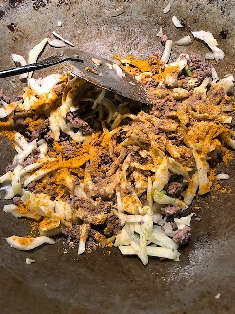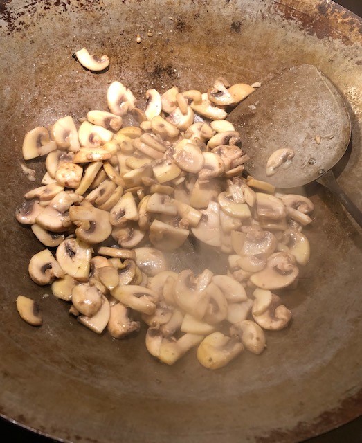 Hetta upp olja en wok och stek champinjonerna tills de är klara och vätskan kokat bort. Ta dem ur pannan och lägg åt sidan. Stek sen köttfärsen i lite mer olja under omrörning tills den är genomstekt. Lägg i vitkål, lök, (ev. ris) och stek i ytterligare några minuter. Lägg i champinjonerna, chili och alla kryddor.