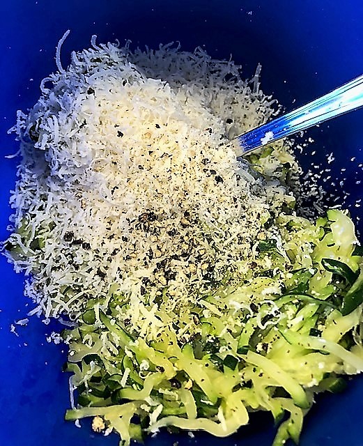 Salta lätt på zucchinin och lägg i ett durkslag. Låt rinna av en stund och krama ur så mycket vätska du kan. Blanda sen med ett uppvispat ägg och parmesanosten.