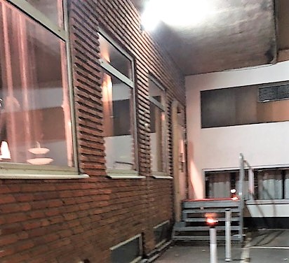 Lite undangömd på en baksida ligger ingången till det rum vi ska sitta i under kvällen. Ett stort bord står dukat och i lokalen finns även en stor disk där maten som serveras under kvällen kommer att läggas upp. Köket ligger precis bakom.