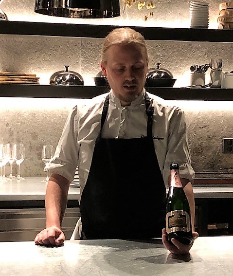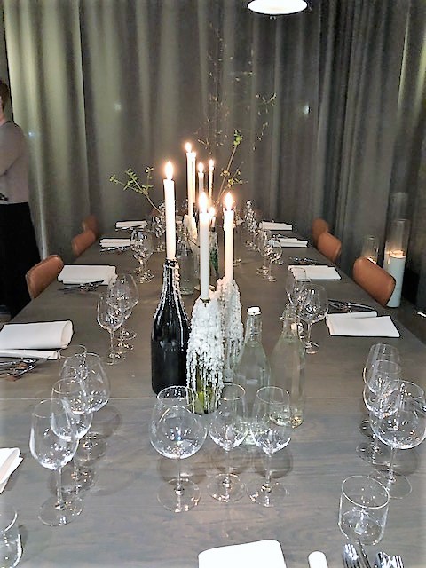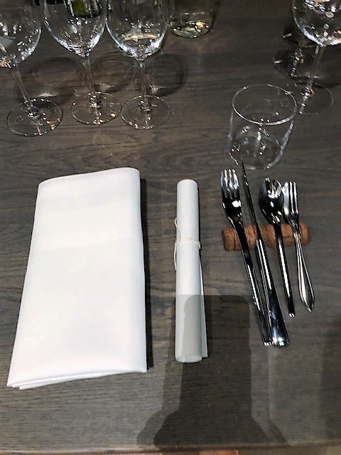 Bordet är dukat och varje kuvert består av fyra vinglas, ett vattenglas, fyra bestick, en servett samt en meny. Glasen och besticken behåller vi under hela kvällen. Allt för att spara disk. Vi kommer bli serverade 13 mindre tallrikar och nästan lika många viner till det men först får vi ett glas champagne.