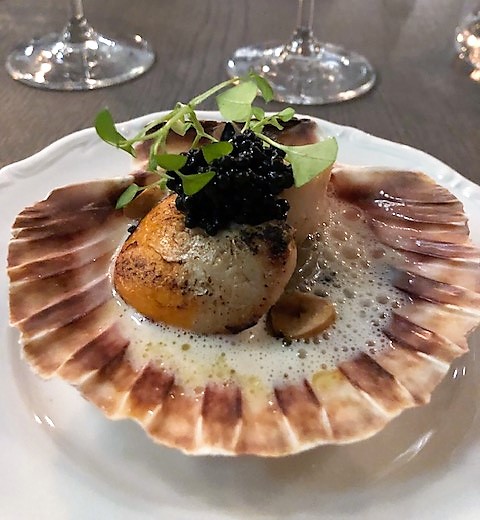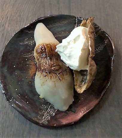 Pilgrimsmussla med vit choklad + Calcotlök med kärnmjölk