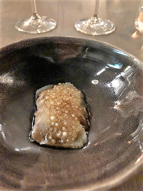 Tunt skivad torsk med tapiokapärlor +Havskräfta med shitake