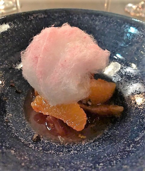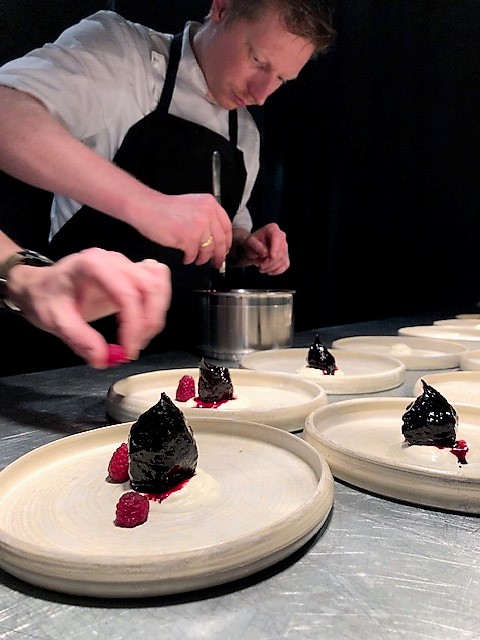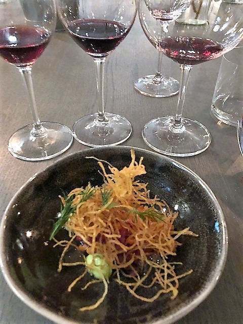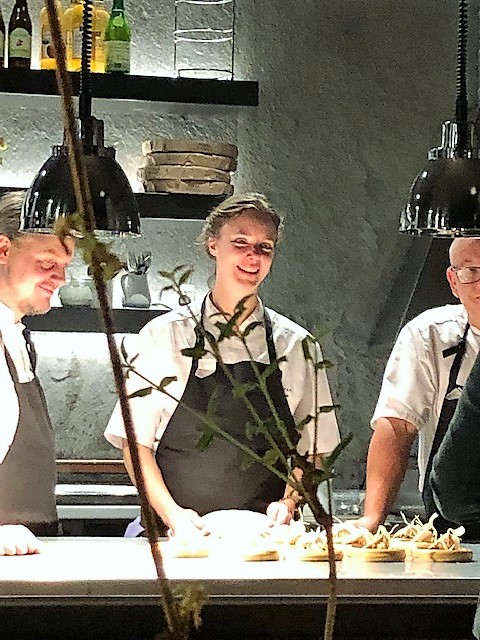 Sen rinner kvällen på i ett behagligt tempo och den ena rätten efter den andra läggs upp framför våra ögon för att sen serveras. Vi får tre olika viner i glasen vid varje påfyllning som ska räcka till 3 eller 4 rätter. Daniel vill att vi smakar alla tre vinerna till de olika 3 rätter vi får in efter varandra för att avgöra vilket vin vi tycker passar bäst till vad. Vill vi kan vi använda det fjärde glaset med en större kupa för att hälla över något av vinerna i för att se om vi tycker att vinet ändrar karaktär. Vi får också veta lite fakta om varje vin vi får i glasen och Titti presenterar varje rätt.