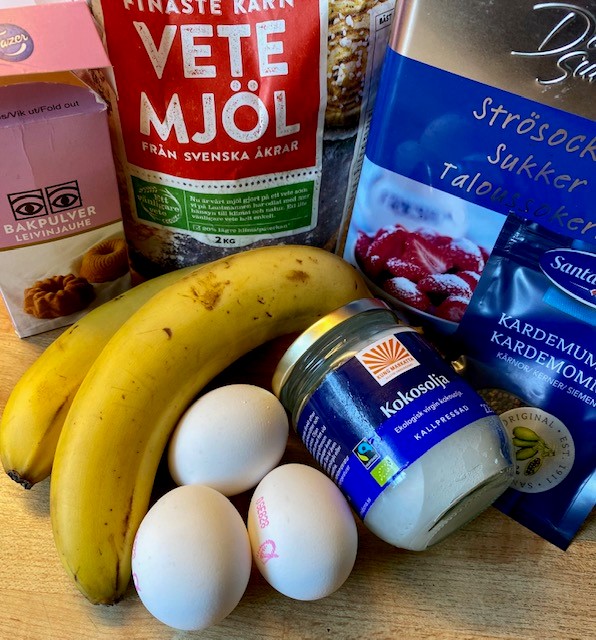 smält kokosoljan i en kastrull. Mosa bananerna, tillsätt kokosoljan, ägg, socker och yoghurt. Blanda ordentligt.