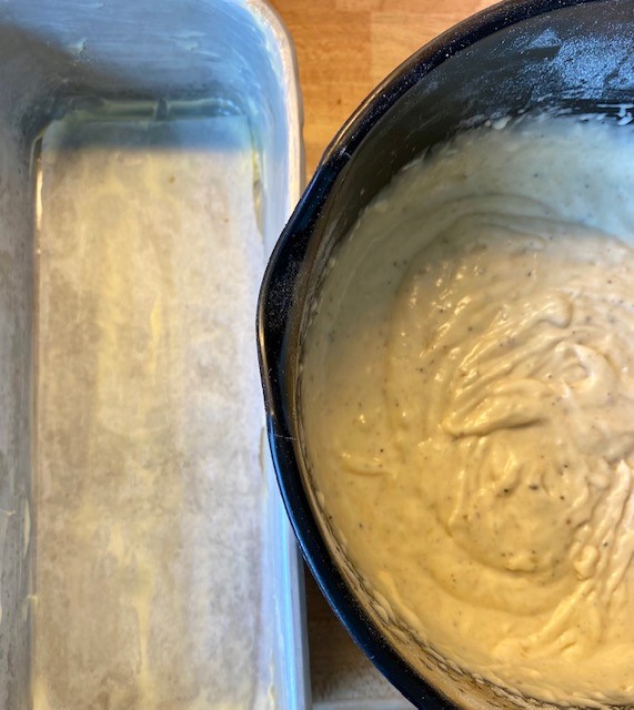 Mixa ihop mjöl, bakpulver, kardemumma och en nypa salt i en skål. Tillsätt de andra ingredienserna och vispa ihop tills smeten är slät. Häll o bakformen.