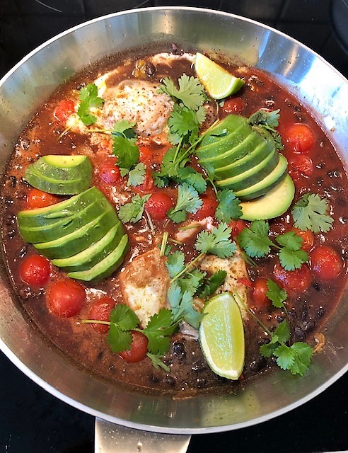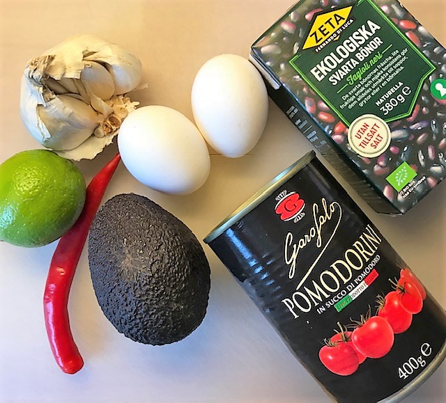 Hetta upp oljan i en teflonpanna. Stek chili och vitlök tills de mjuknar och börjar få lite färg. Kläck i äggen i pannan. När de börjar stelna tillsätter du de avrunna bönorna, tomaterna och kryddar med salt och spiskummin. Rör om försiktigt utan att skada äggen och låt puttra tills allt är varmt. Ta av från värmen, smaka av röran och krydda ev. med mer salt och lite peppar. Lägg på den skivade avokadon, strö på koriander och droppa lite lime över det hela. Servera direkt!
