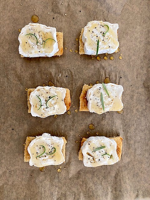 Sätt igång grillelementet i ugnen på högsta temperaturen. Skär bort kanterna på brödet. Stek sen skivorna krispiga i en stekpanna eller rosta den lätt i brödrosten. Lägg dem på en plåt med bakplåtspapper. Lägg på osten, ringla över flytande honung, strö på nymalen svartpeppar och gratinera i ugnen ca 4-5 minuter tills osten precis börjar smälta.