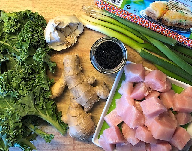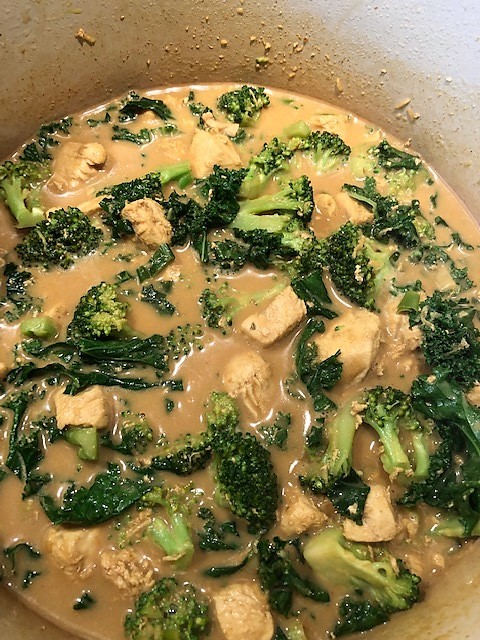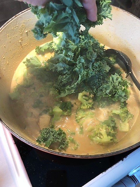 Tillsätt ½ msk olja till i pannan och stek vårlöken någon minut, tillsätt sen även vitlök, ingefära och curry. Stek någon minut och tillsätt sen kycklingen, broccoli samt soja, kokosmjölk och buljongen. Strö på maizena och koka upp under omrörning. Rör i grönkålen och ta av från värmen. Smaka av och krydda ev. med salt och peppar.