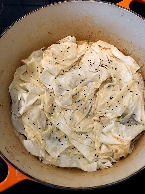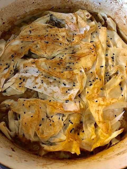 Blanda resterande olja med några msk av såsen i grytan och pensla filodegsarken med blandningen. Lägg sen på degarken som ett lock över rätten, strö på Nigellafrön om du använder det, och sätt in i ugnen ca 15 minuter tills locket fått fin gyllene färg.