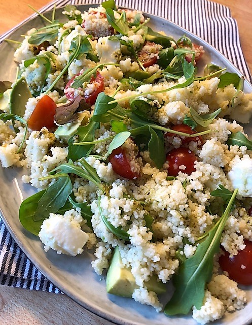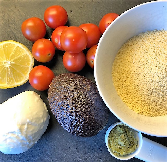 Tillaga couscousen i buljong enligt instruktionen på paketet. Blanda ihop pesto, citronsaft och olja till en dressing. När couscousen är klar lägg över den i en stor skål. Blanda i dressingen och tillsätt resten av ingredienserna. Blanda runt och servera.