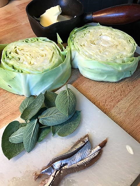 Stekt spetskålen i smör och rapsolja tills den mjuknar lite. Salta och peppra. Fräs salviablad i 50 g smält smör tills dom ”drar ihop” sig lite och låt rinna av på papper (dom ska bli lite krispiga när dom torkar). Hacka ansjovisfiléerna och rör ner dem i det smälta smöret.
