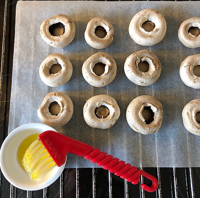 Värm ugnen till 225 grader om du ska servera dem ugnsbakade. Borsta svampen och ta försiktigt bort foten. Finhacka svampfötterna och blanda med ost och persilja. Lägg champinjonerna med hålet uppåt på en ugnsplåt. Pensla på lite olja runt kanterna. Sätt in i ugnen ca 10 minuter. Det kommer att bildas vätska i urgröpningen på champinjonerna så ta ut dem och häll av det efter halva tiden.