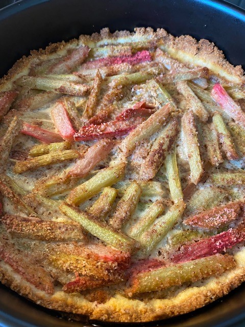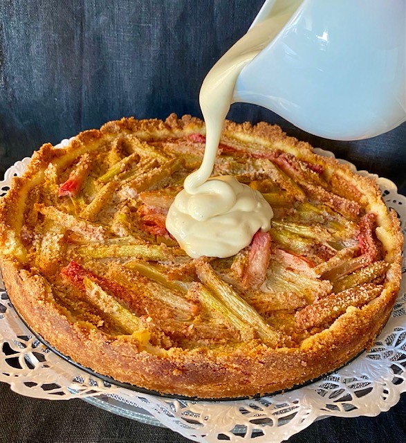 Skär rabarbern i bitar. Blanda den med socker, kanel och mjöl. Lägg fyllningen i formen och häll på grädden. Grädda i nedre delen av ugnen 45-60 minuter. Fyllningen ska sätta sig men ändå vara lite kladdig.