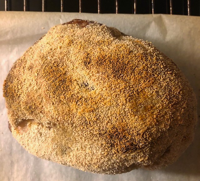 Sätt ugnen på 200 grader med grillelementet igång. Ta bort ev. svål. Sikta potatismjöl över skinkan. Blanda ihop äggula och senap. Bred blandningen över skinkan. Sikta över ströbröd i ett ganska tunt lager. Ställ in skinkan mitt i ugnen tills den fått fin färg.