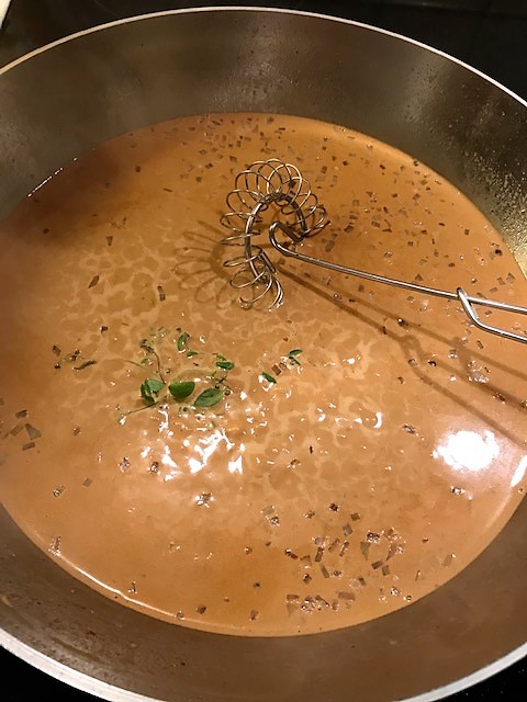 Smaka av med salt och peppar och häll ev. i lite konjak. Vill man ha såsen tjockare kan man reda med lite Maizena. Ta bort timjankvisten och servera.