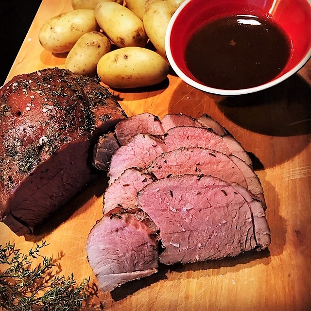 Gör en sås genom att hälla spadet från steken i en kastrull och tillsätt 1 msk flytande kalvfond, 1 dl vatten, 1 msk balsamvinäger och ca 1 msk idealmjöl under omrörning. Smaka av med salt och peppar. Servera med t.ex krossad ugnspotatis och syltade nypon.