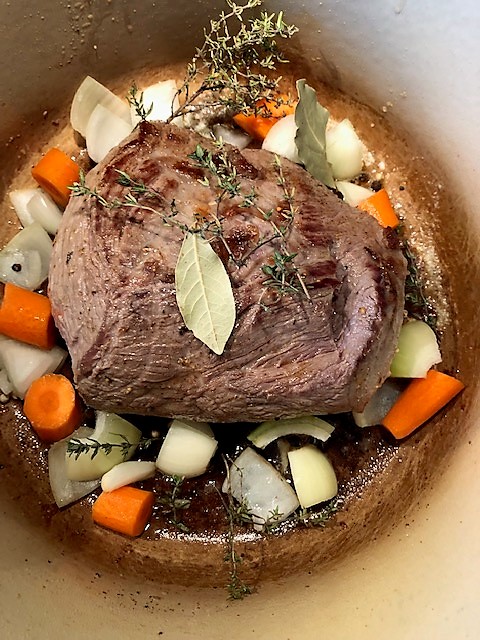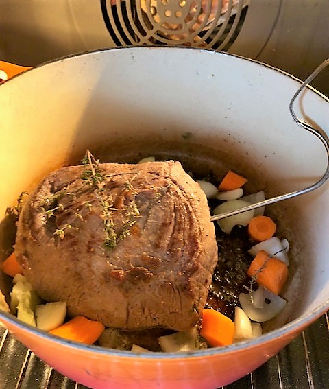 Värm ugnen till 175 grader. Krydda kalvsteken med salt och peppar och bryn den runt om i en hög ugnssäker gryta. Lägg i morötter, lök och kryddor. Sätt i en köttermometer i köttets tjockaste del och ställ in grytan i ugnen på nedersta falsen. Stek utan vätska i ca 20 minuter. Häll sen på buljongen och ös steken några gånger med vätskan under tillagningen. Steken är rosa vid 65 grader och tar ca 1 timme. Ta upp köttet och låt det vila medan du tillagar såsen.