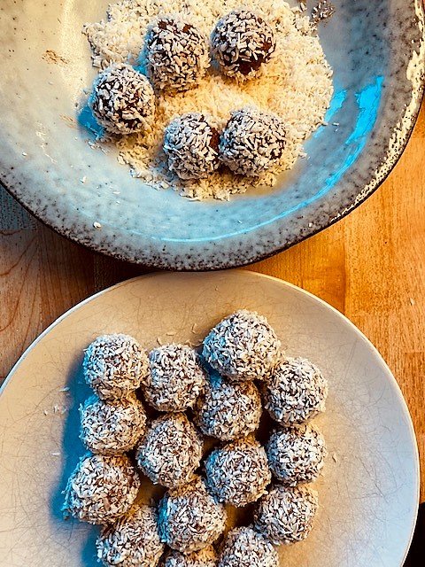 Låt stelna i kylskåp ca 30 minuter och forma sen bollar som rullas i riven kokos.