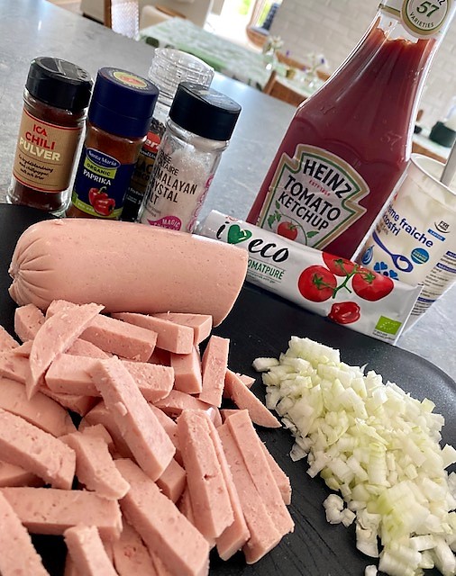 - 400 – 500 gram falukorv, valfri sort i strimlor om ca 1 cm