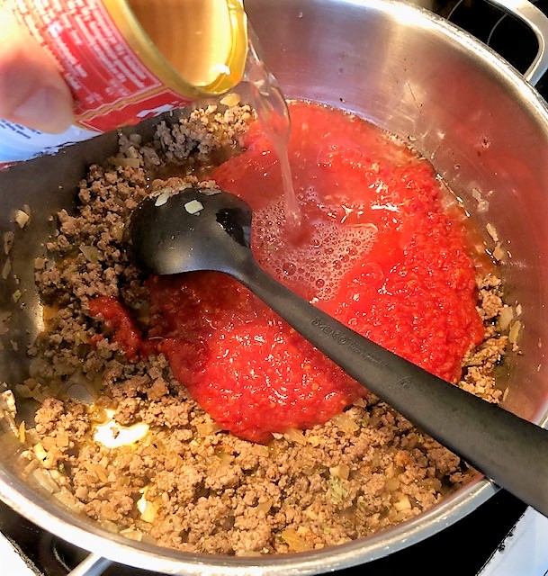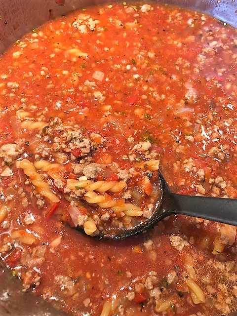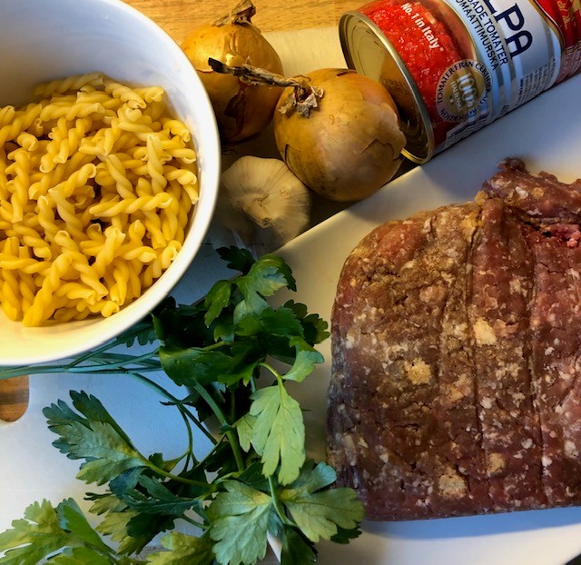 Hetta upp oljan i en stor panna. Stek löken mjuk och tillsätt vitlök, tomatpuré och köttfärs. Stek under omrörning tills köttfärsen är genomstekt. Krydda med salt, peppar, oregano och basilika. Häll på tomaterna och buljong/vatten. Småkoka under lock tills pastan är klar. Späd med mer vätska och smaka av med mer kryddor om det behövs.