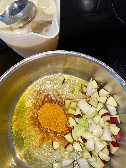 Fräs lök och äpple i smör och olja. Tillsätt currypulver, rör ner mjöl och späd med buljong, lite i taget, under omrörning. Tillsätt råsocker, grädde och mjölk. Låt småkoka ca 10 minuter och rör om då och då. Sila såsen och smaka av med salt och peppar.