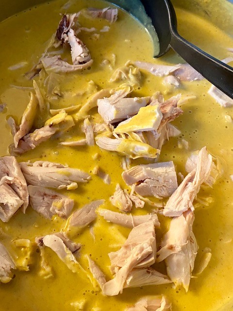 Lägg i köttet från kycklingen du kokte fonden på eller andra benfria delar av kyckling. Servera med ris och ev. lite extra currypulver.