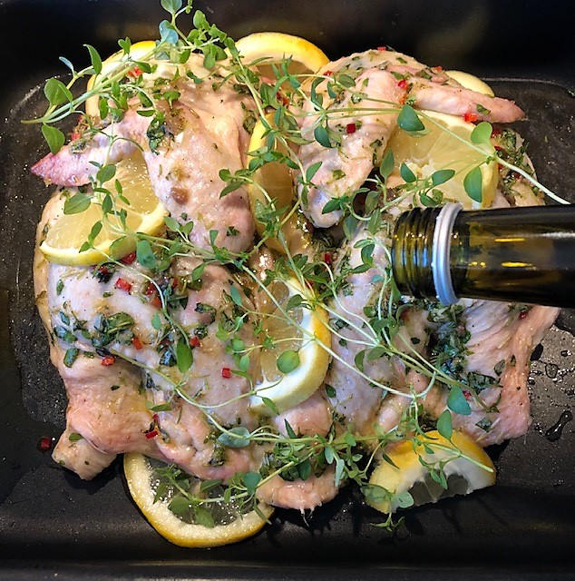 Värm ugnen till 225 grader. Skär kycklingen längst bröstbenet och vik ut den så den blir platt. Blanda ihop olivolja med riven vitlök, sardellerna, hälften av timjanen (som du först hackar), chilifrukt, salt och svartpeppar.