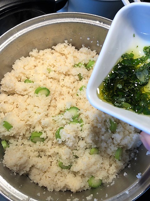 Ansa sparrisen och skär undre halvorna i skivor. Tillaga couscousen i buljong enligt instruktion på paketet och tillsätt även den skivade sparrisen. (Häll ev. även på lite olivolja blandad med färsk timjan för att få extra smak på couscousen).