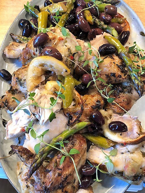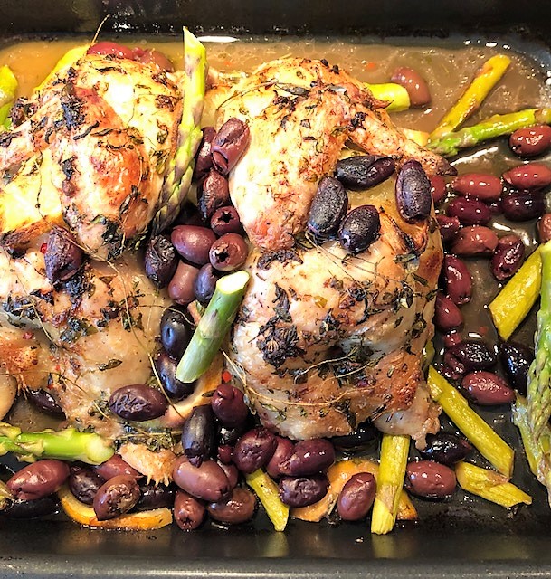 Saftig och god kyckling med Medelhavssmaker. Svarta oliver, sardeller, vitt vin och timjan bidrar alla med otroligt mycket smak.