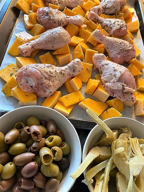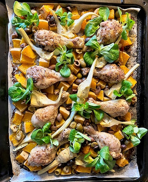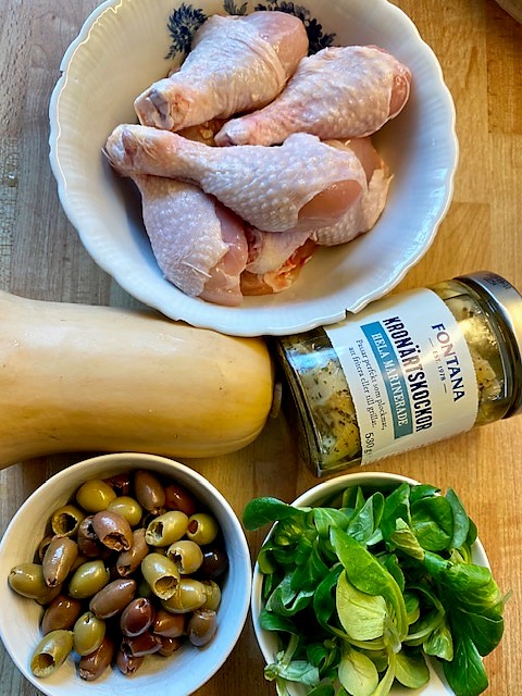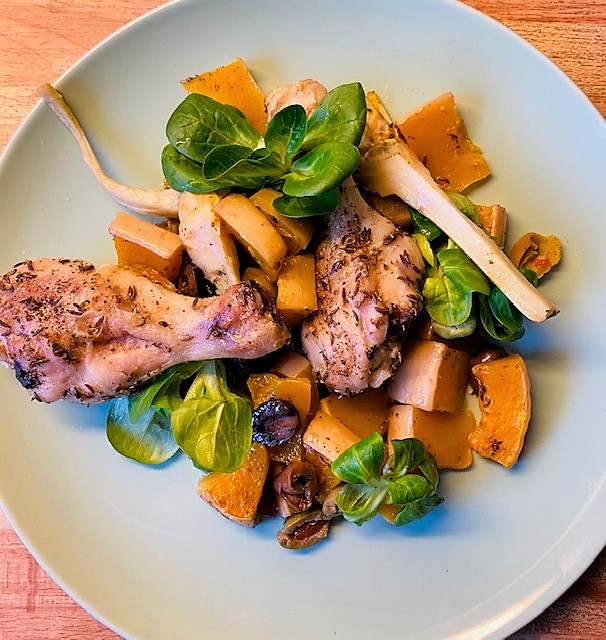 Tillaga mitt i ugnen ca 45 tills kycklingen är genomstekt och pumpan mjuknat.