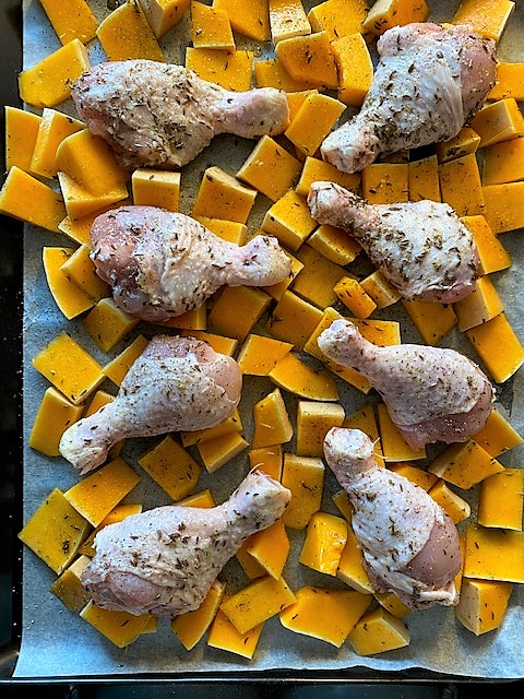 Lägg kycklingben och pumpa i en ugnsfast form och häll på oljeblandningen. Salta och peppra.