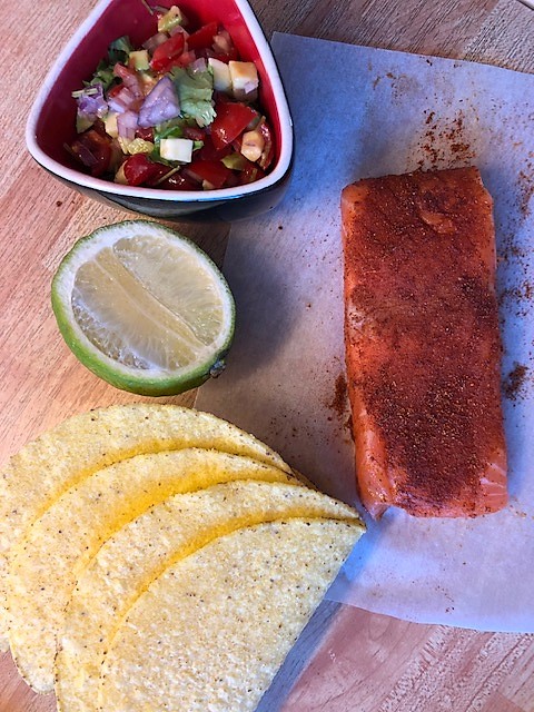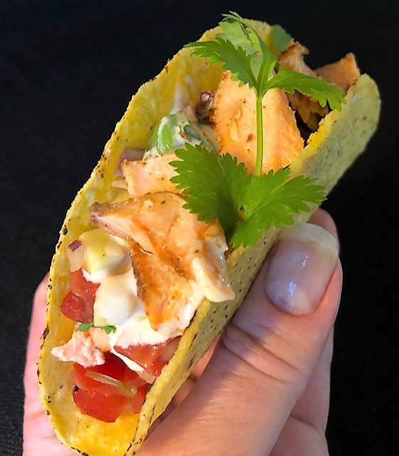 Tacos är väl inte direkt något man förknippar med lågkalorimat precis. Men med grillad lax, salsa, vitlöksyoghurt och avokado blir det en riktigt god och kalorisnål måltid. Innehåller ca 500 kcal/portion.