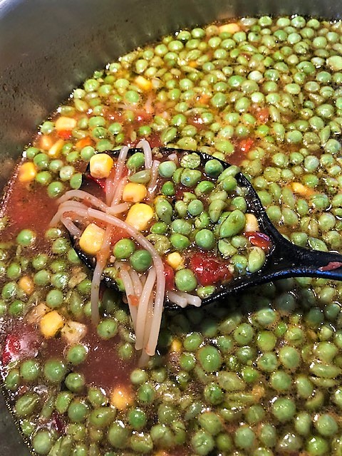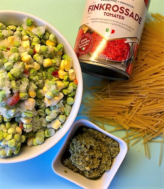 Koka upp buljongen och de krossade tomaterna. Lägg i spaghettin och koka ca 6 minuter. Lägg sen i de frusna grönsakerna och koka upp på nytt. Tillsätt peston och låt puttra 2-3 minuter tills grönsakerna är klara.