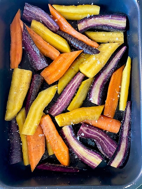 Gillar man balsamvinäger kan man även hälla på någon matsked innan morötterna går in i ugnen. Hackade hasselnötter eller macadamianötter fungerar också väldigt bra i denna rätt.