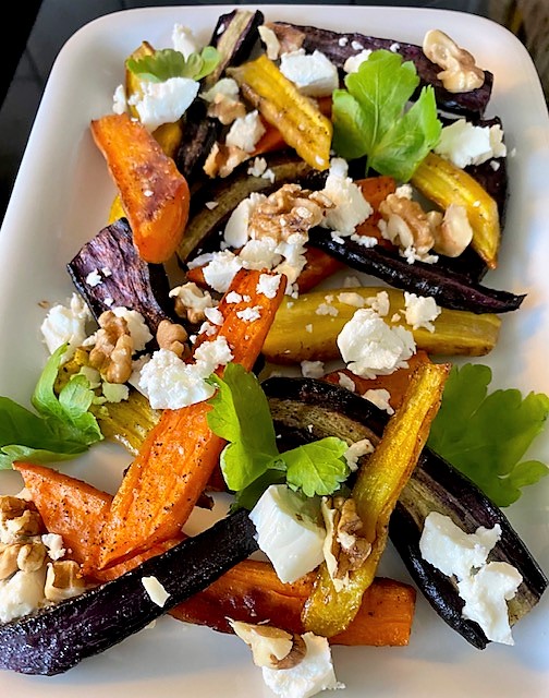 Ugnsbakade morötterna och smulade på fetaost och hackade valnötter.