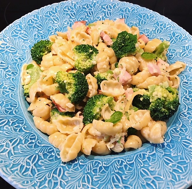 God, supersnabb och lättlagad vardagsmat med ganska få ingredienser, som kan lagas i samma panna. Skink- och broccolipasta med krämig ostsås.