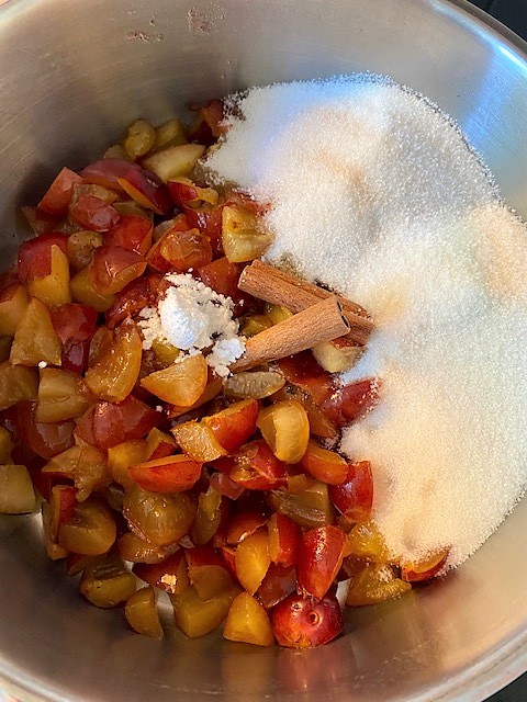 Kärna ur och skär plommonen i mindre bitar.