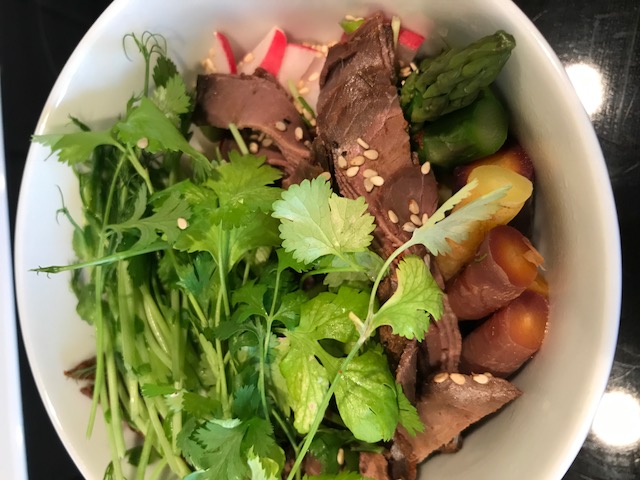 Man kan ju ha i lite vad man vill i en bowl. Här hade jag rester av rostbiff, morötter och lite sparris som blev en god grund ihop med en lite starkare asiatisk buljong (brukar gå att hitta olika sorter och styrkor i asiatiska matbutiker).