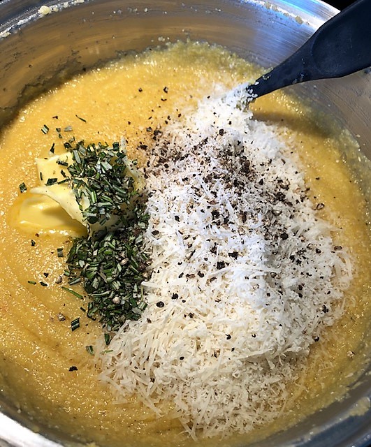 Koka upp buljongen i en kastrull och häll på polentan. Koka upp och låt småkoka ca 8 minuter under omrörning. Ta av från värmen och rör i smör, parmesanost, rosmarin, och smaka av med salt och peppar. Häll över på bakplåten och fördela jämt över plåten. Tillaga mitt i ugnen 30 minuter.