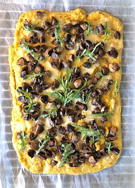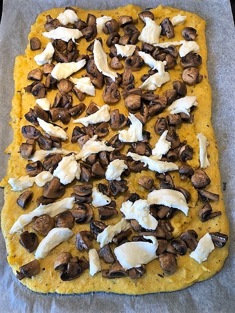 Ta ut polentan ur ugnen, lägg på champinjonerna och riv över mozzarellaosten. Sätt in i ugnen ytterligare ca 10 minuter tills osten smält och fått fin färg.