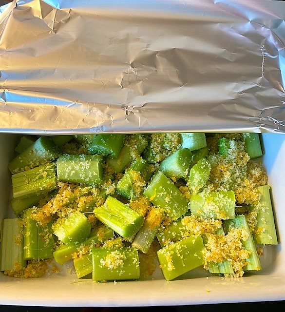 Värm ugnen 180 grader. Lägg den skurna rabarbern i en ugnsfast form, strö på hälften av sockret, zest från apelsinen och blanda ihop. Täck formen med folie och baka mitt i ugnen 35-40 minuter tills rabarbern är mjuk. Hit kan du förbereda dagen innan om du vill.