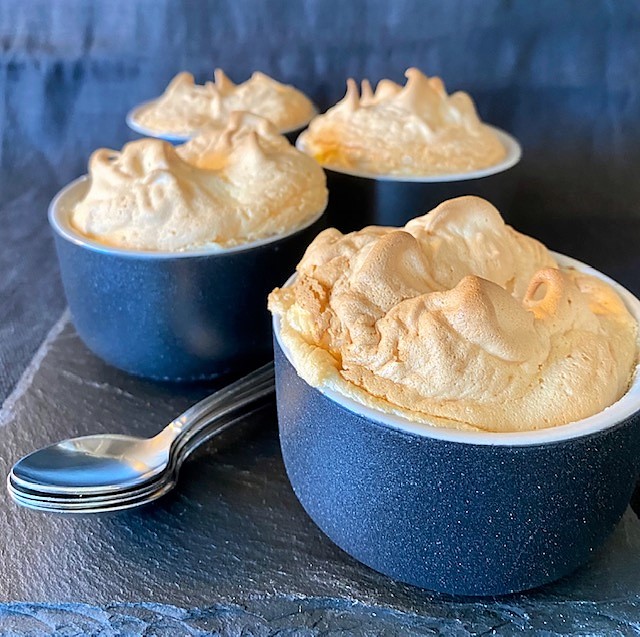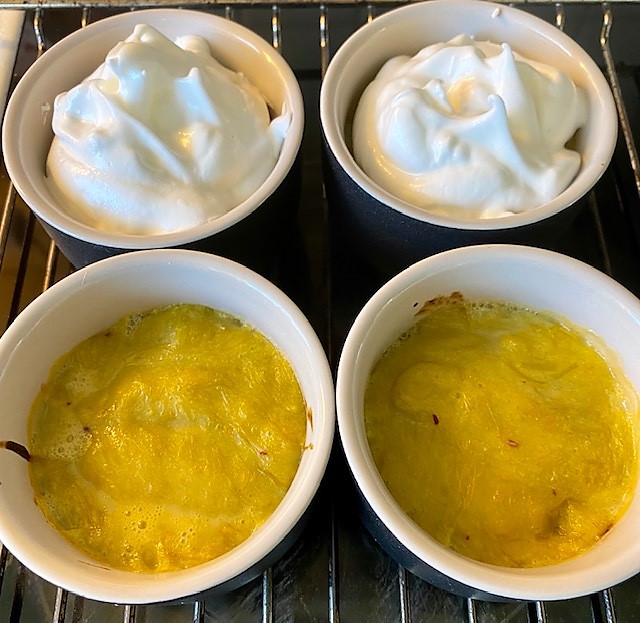 Ta ut formarna ur ugnen, toppa dem med marängsmeten och sätt in i ugnen ca 10 minuter ytterligare tills marängen är fluffig och lite gyllenbrun. Servera direkt.